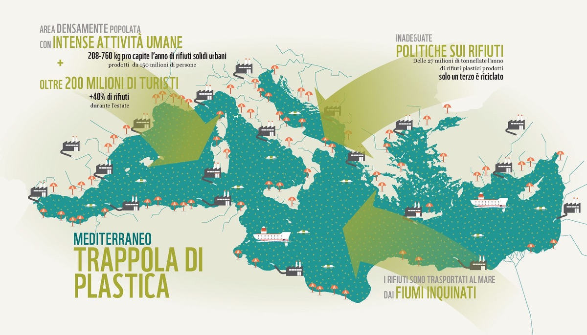 Lungo le coste mediterranee vivono 150 milioni di persone, che producono tra i maggiori quantitativi di rifiuti solidi urbani pro capite, tra i 208 e i 760 kg l’anno. I turisti che ogni anno visitano il Mediterraneo generano un aumento del 40% dell’inquinamento estivo da plastica. I rifiuti plastici sono trasportati anche da fiumi come il Nilo, l’Ebro, il Rodano, il Po, i due fiumi turchi Ceyhan e Seyhan che sfociano tutti in mare dopo aver attraversato aree densamente popolate.